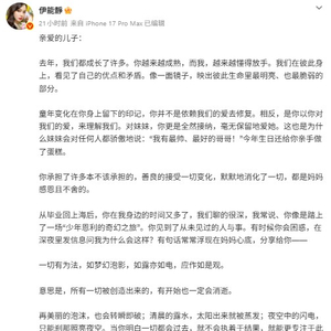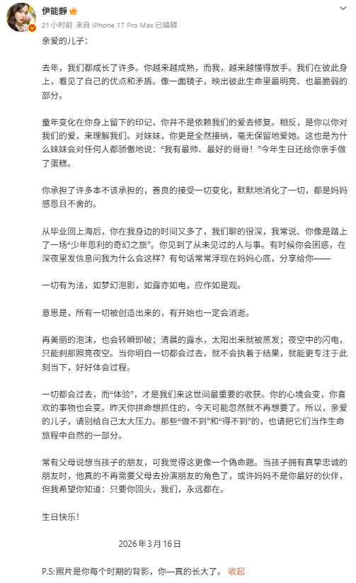伊能静写下对儿子的感谢与祝福。(截自伊能静微博)