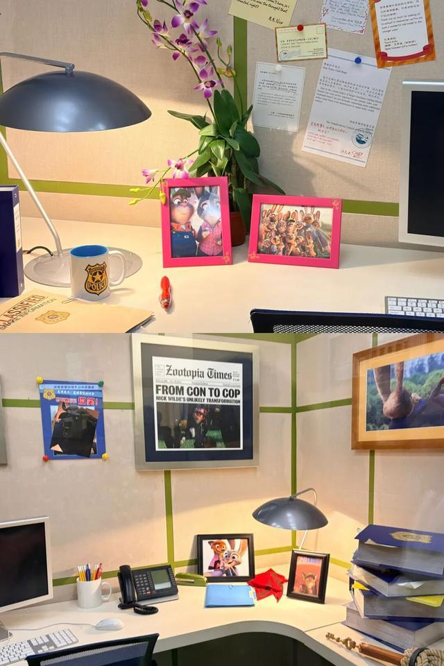 在上海迪士尼疯狂动物城园区里,朱迪(上)和尼克(下)的办公室已经更新了第二部的细节。