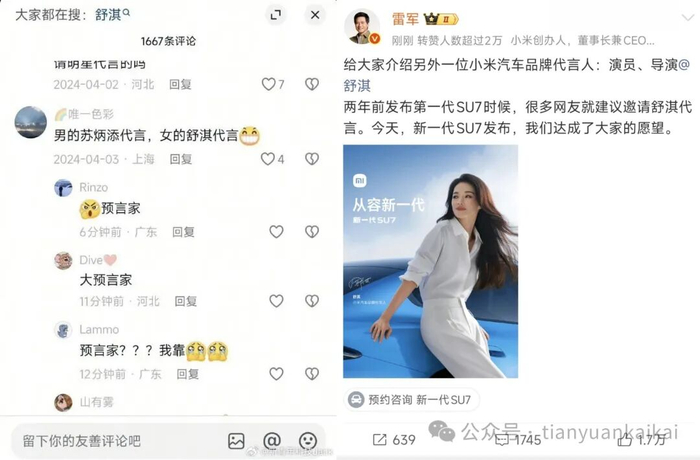 其实在两年前就有人给小米汽车出建议,SU7男代言人找苏炳添,女代言人找舒淇,现在新一代SU7要发布了,果然是这两位代言人,评论说朋友被网友挖出来,封为预言家,这不是巧了嘛,哈哈。