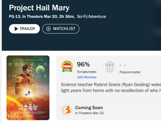 口碑稳了!高司令主演太空科幻惊悚片《挽救计划》烂番茄开分96%3月20日内地与北美同步上映