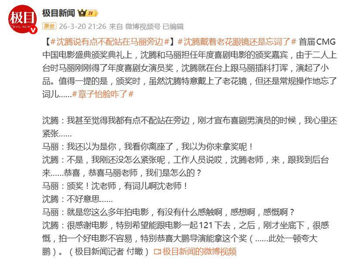 3月20日的首届CMG中国电影盛典颁奖礼上,沈腾与马丽这对“黄金搭档”一上台,瞬间就把颁奖现场变成了即兴小品舞台。一句“我甚至觉得有点不配站在马丽旁边”的自嘲式调侃,配上马丽“我看你离座了,我以为你来拿奖呢!”的精准接梗,短短几十秒,就把两人二十年的默契展现得淋漓尽致。