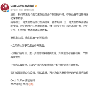 2月28日,针对有门店销毁前代言人王一博合作物料引发的争议,连锁咖啡品牌库迪咖啡发布致歉声明称,公司与王一博的合作已圆满结束。对于此次个别门店的不当行为,库迪咖啡向王一博、粉丝及广大消费者诚恳致歉。