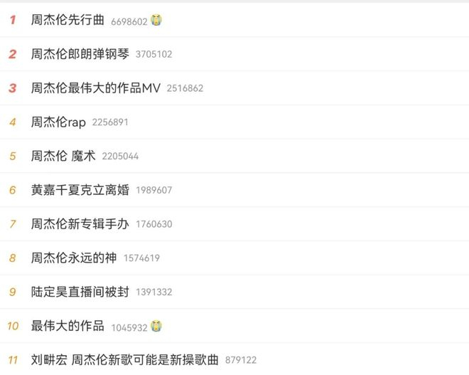 7月6日中午12点整,预约人数远超600万人次的周杰伦新专辑MV终于迎来首发,话题热度短短数十分钟里就有了千万阅读量,在随后不到一小时的时间内,热搜前十就有八个被周杰伦的新专辑包揽。