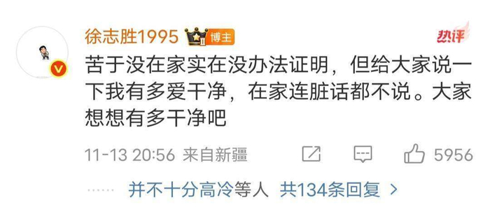 徐志胜对此作出了回应,他引用古文称:“谈笑有鸿儒,往来无白丁,何脏之有?”并幽默地补充说,在家里连脏话都不说,暗示自己家里是相当干净的。