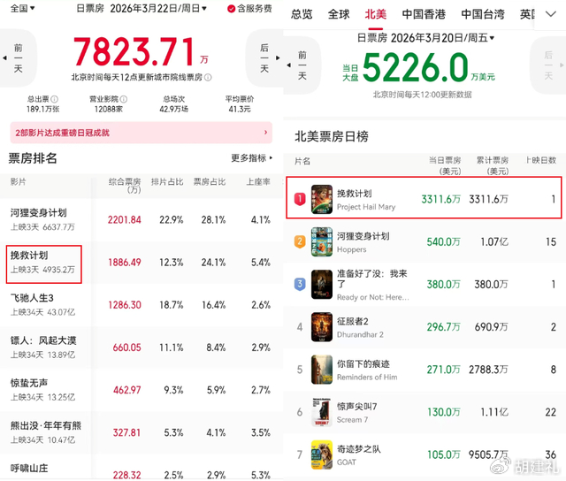 《挽救计划》北美口碑爆棚,烂番茄新鲜度高达95%,中国市场的口碑也很好,豆瓣8.5分,为何中国内地票房不如人意,北美票房却大火特火?