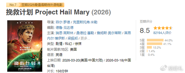 《挽救计划》延续了安迪·威尔标志性的硬科幻风格——大量科学细节、技术流叙事、以及主角依靠专业知识解决危机的套路。这种风格在北美市场广受好评,烂番茄95%的新鲜度和豆瓣8.5分的开局评分,证明影片在科幻核心受众中获得了高度认可。