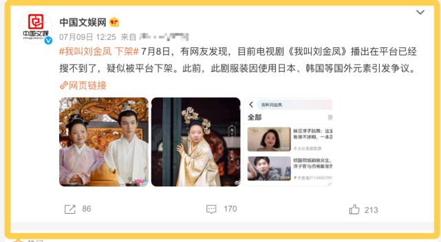 据悉,辣目洋子主演的一部小成本古装剧《我叫刘金凤》,服装涉嫌“以倭代唐”,此后疑似被下架。