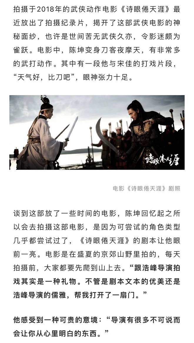 陈坤的硬照充满故事感之外,作为演员的他也塑造了不少经典角色,《寻龙诀》、《火锅英雄》、《龙门飞甲》等经典影视作品百看不腻。前段时间《诗眼倦天涯》放出侧拍纪录片,片中的陈坤变身刀客夜摩天,有非常多的武打动作。其中有一段他与宋佳的打戏片段,“天气好,比刀吧”,眼神张力十足。