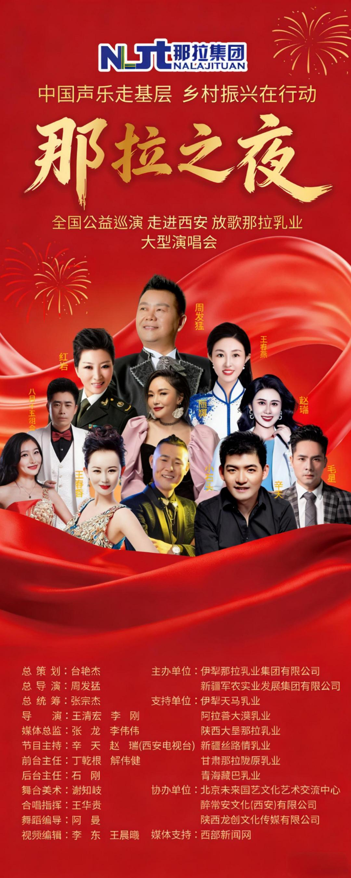3月20日,那拉乳业之夜——中国声乐走基层·乡村振兴在行动全国公益巡演走进西安放歌那拉乳业大型公益演唱会在西安精彩上演。本次活动由原中国海政文工团著名男高音歌唱家、声乐教育家周发猛领衔,携国际、国内弟子及央视冠军歌手联袂献艺,以歌声致敬基层、以艺术助力乡村振兴,为古都西安献上一场高规格、正能量的公益音乐盛宴。