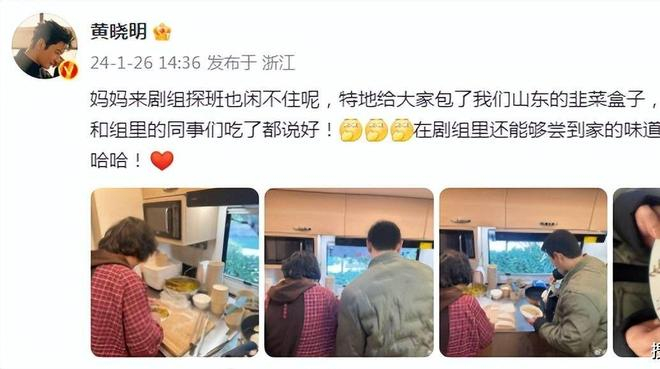 黄晓明透露,这天他的母亲特意前来探班,还为剧组人员带来了家乡山东的美食——韭菜盒子。这道家乡小吃不仅让黄晓明回味起童年的记忆,也让剧组人员领略到了家乡的味道。他笑着说:“有我妈妈在,感觉好幸福。