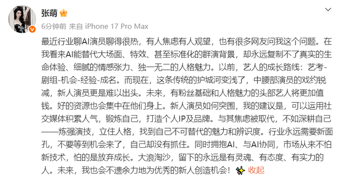 张萌发文称:“最近行业聊AI演员聊得很热,有人焦虑有人观望,也有很多网友问我这个问题。在我看来AI能替代大场面、特效、甚至标准化的群演背景,却永远复制不了真实的生命体验、细腻的情感张力、独一无二的人格魅力。以前,艺人的成长路线:艺考-剧组-机会-经验-成名。而现在,这条传统的护城河变浅了,中腰部演员的戏约锐减,新人演员更是难以出头。未来,有粉丝基础和人格魅力的头部艺人将更加值钱。好的资源也会集中在他们身上。新人演员如何突围,我的建议是,可以运用社交媒体积累人气,锻炼自己,打造个人IP及品牌。与其焦虑被取代,不如深耕自己——炼强演技,立住人格,找到自己不可替代的魅力和辨识度。行业永远需要新面孔,不要等到机会来了,自己却没有抓住。同时拥抱AI、与AI协同,市场从来不怕新技术,怕的是放弃成长。大浪淘沙,留下的永远是有灵魂、有态度、有实力的人。未来,我也会不遗余力地为优秀的新人创造机会!”