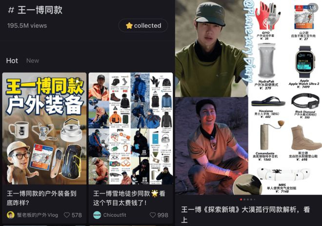 但凡你在小红书搜索框键入「王一博」,与《探索新境》相关的话题均是平台爆点,内容向的有曾冲上小红书热点首位的 #王一博岩壁睡觉#,种草向的有笔记数量超4万+的 #王一博探索秘境同款# 等,带动了户外运动领域诸多专业账号科普或深扒节目里的户外导师、户外穿搭或户外用品,可谓一个顶流喂饱了万千博主。