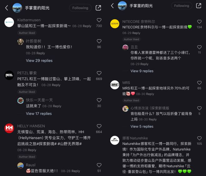 比如在王一博铁粉「手掌里的阳光」发布的小红书爆款笔记底下,就有攀山鼠Klattermusen、攀索PETZL、莱德雷神LEDLENSER、奈特科尔NITECORE、MAS等户外品牌官号排队喊话节目和王一博,顶流艺人辐射节目内外的“带货力”可见一斑。
