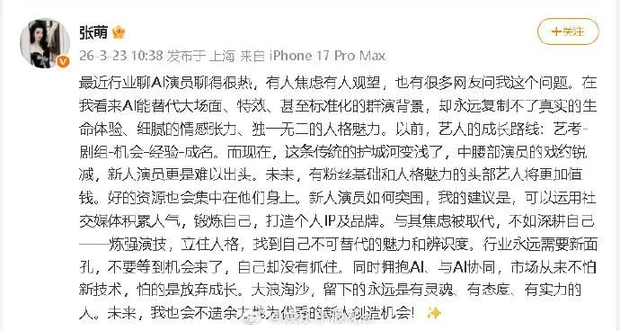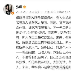虎扑03月23日讯 近日,演员张萌发文谈及“AI演员”这一行业热议话题。她表示,AI能替代大场面、特效甚至标准化的群演背景,但“永远复制不了真实的生命体验、细腻的情感张力、独一无二的人格魅力”。