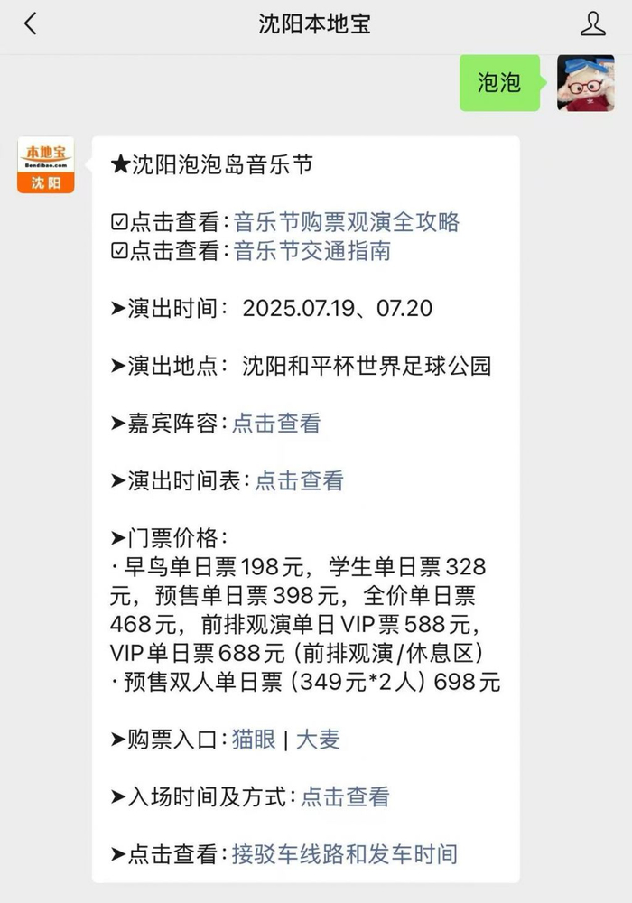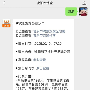 温馨提示:微信搜索并关注公众号【沈阳本地宝】,在对话页面输入并发送【泡泡】,可以获取2025沈阳泡泡岛音乐节演出时间、歌手出场顺序、入场/散场安排、舞台示意图、交通指南、购票渠道等相关信息。