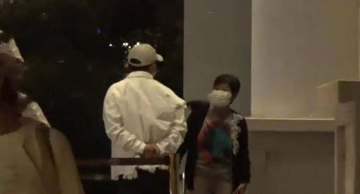 黄波的妻子先下了车,他紧随其后。他们两个站在酒店门口聊天,好像在等人。他的妻子小欧穿着一件情侣白大褂,留着时髦的黄色短发,身材高挑苗条,戴着黑色口罩显得很有力量。