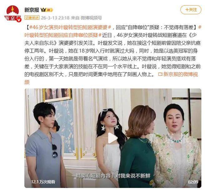 3月13日晚,46岁的女演员叶璇凭借一头扎进短剧领域,在《少夫人来自东北》中饰演豪门婆婆,迅速在娱乐圈和网友之间掀起了热议。她的这一举动引发了不少质疑声,许多人认为她是在自降咖位或者没有戏拍才选择演短剧,一时间,讨论不断。
