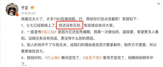 2025年7月12日,于正在七七母亲的账号评论区留言称“私信发不了,不知道怎么联系”。7月15日,于正在微博发文表示已与七七取得联系,但尚未见面,后续进展将及时公布。