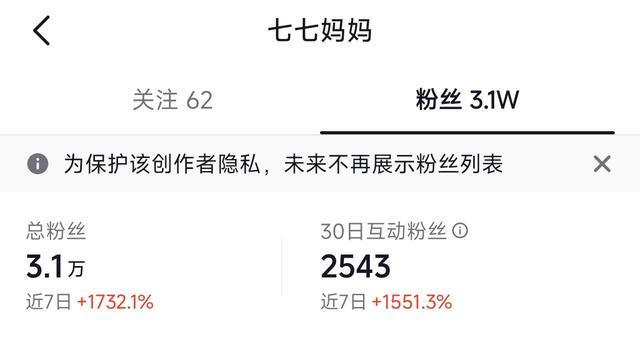 视频平台数据显示,七七妈妈目前总粉丝量为3.1万,近七日涨幅1732.1%。根据计算7天前的粉丝量大约为1690,近七日涨粉超2.9万。