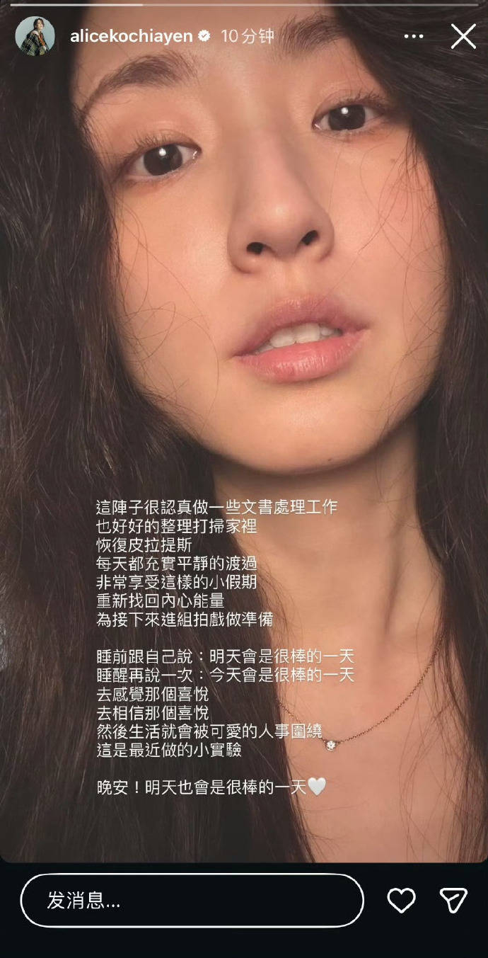次日(3月24日),柯佳嬿本人在社交平台(Instagram)发文侧面回应,描述近期生活状态:通过整理家务、恢复普拉提训练等方式“重新找回内心能量”,并明确表示正“为接下来进组拍戏做准备”。