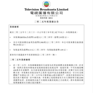 3月25日,TVB向封面新闻记者发来《2025年度业绩公告》。报表显示,TVB在2025年实现了正向盈利,这是自2018年以来,TVB首次转亏为盈。