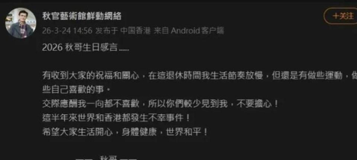 不是开记者会,不是上电视,就通过一个叫“秋官艺术馆鲜动网络”的粉丝会账号,发了一段话,署名“秋哥”。