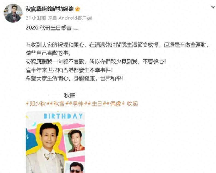 就在昨天,3月24号,农历生日这天,79岁的郑少秋,那个我们记忆里永远风度翩翩的“秋官”,终于“冒泡”了。