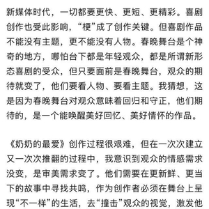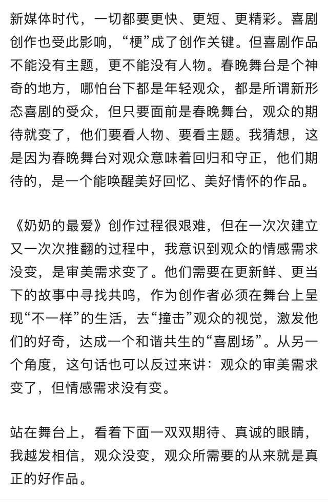 重回春晚,我发现一切似乎都没变。创作春晚小品,是我经历过的最艰难的工作,它有小品的共性:一是完整统一的事件;二是舞台上没有蒙太奇、没有时空跳跃、没有转场;三是在有限的时间里,人物关系要发生根本性的转变。除了这些,还有两个独属于春晚的要求:第一,欢乐度,要让观众开怀大笑;第二,老少咸宜。可这两条从根本上甚至是冲突的,因为现在的喜剧很难做到老少咸宜,年轻人笑的地方,老年人看不懂,老年人笑的地方,年轻人嫌太旧。给所有人带来欢乐,是春晚演员的职责,我能做的,就是拼尽全力。