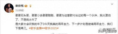 在歌手2025赛季的首轮争霸中,单依纯在夺得周冠军后,立刻在社交媒体上发声,感慨道:“大家都太会给我捧场了!”5月16日晚,她凭借着出色的表现斩获了第一期的周冠军,随后她感谢了所有的支持者:“特别感谢石头哥、小余和聪聪,感谢为这首歌付出努力的每一位伙伴,我真的太激动了,不是我太厉害,而是大家的支持实在太给力了!今天我全力以赴,接下来的目标是继续拼尽全力,下周见!”
