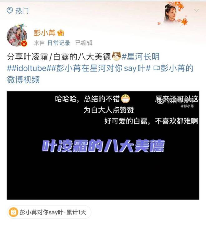 追完剧后,许多网友表示叶凌霜的人设很有意思,做事清醒冷静,勇打直球。当偷书被陛下抓包时,叶凌霜不慌不忙,直球表示自己是因为仰慕陛下才来找出的,甜言蜜语哄得陛下心服口服;当发现自己被人跟踪时,叶凌霜也能处变不惊,甚至还直呼对方“小哥哥”,结果惹得陛下误会是在叫自己,场面十分有趣。12月11日,彭小苒在个人微博中分享了叶凌霜/白露的八大美德视频,视频中,叶凌霜/白露在与自己的上司和同事交往时也经常仗义执言、诚实坦率,金句频出,活脱脱一个“嘴强王者”。看完视频后,网友们纷纷表示:“白露可真是个小机灵鬼”、“我也学会了,可以去董事长的办公室坐坐了”。