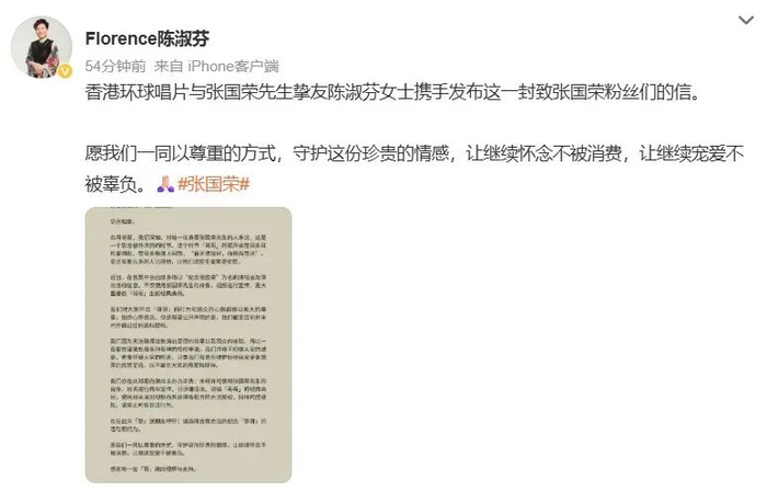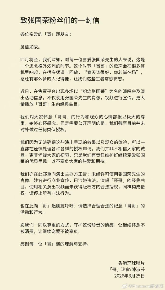 3月25日,香港环球唱片与张国荣挚友陈淑芬携手发布了一封致张国荣粉丝们的信。