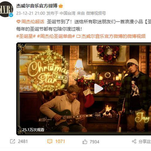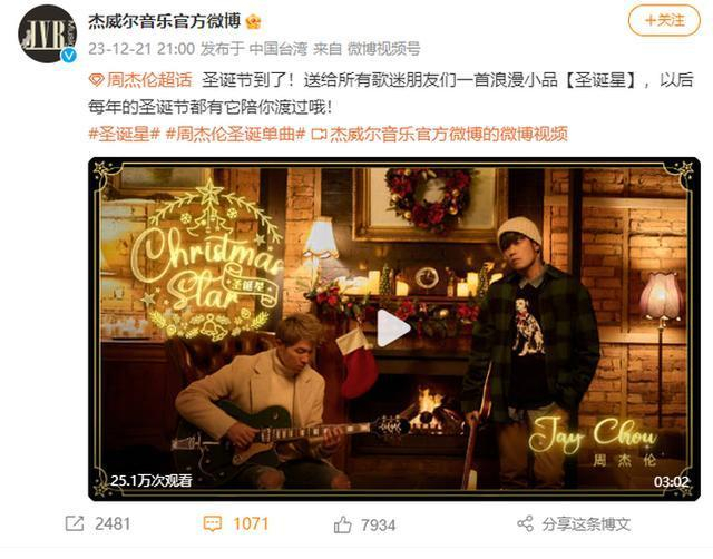 21日晚,@杰威尔音乐 官方微博发布了周杰伦的新歌《圣诞星》。周杰伦新歌上线相关词条迅速登顶热搜。