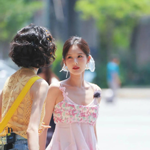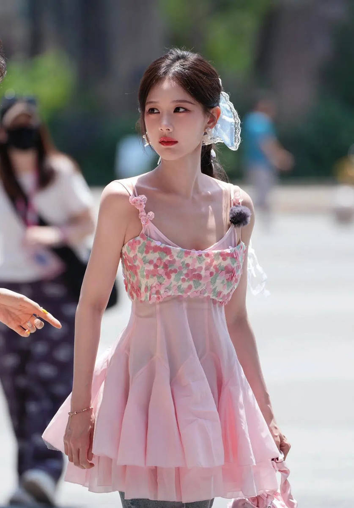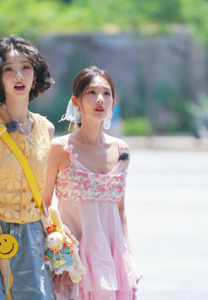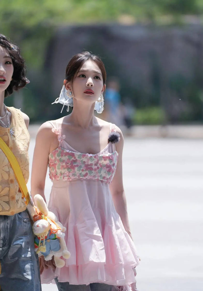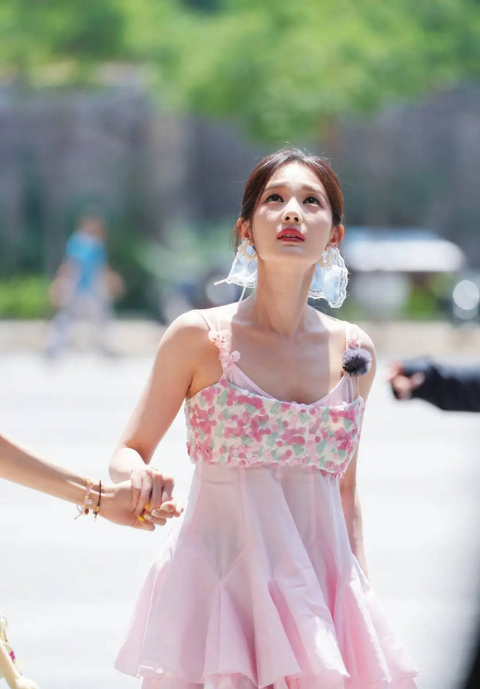 阳光穿过街边的棕榈树,就那么恰好地落在李一桐身上。一件粉粉嫩嫩的吊带背心,一条清爽的蓝色发带,她手里攥着杯果汁,蹦蹦跳跳往前走,头发丝儿都跟着跳起来,镀着一圈金边——看到照片的人第一反应都是:哎哟喂,这哪是路透照啊,这不就是一块会走路、冒着仙气的草莓奶油蛋糕吗!