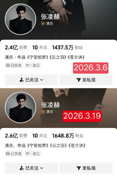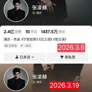 创纪录的涨粉速度:20天内,张凌赫微博涨粉超400万、抖音新增302万、小红书59万、INS涨粉61.7万,合计536.7万,日均吸粉超26万,单日峰值达20万+,创下95后小生单剧涨粉最高纪录。