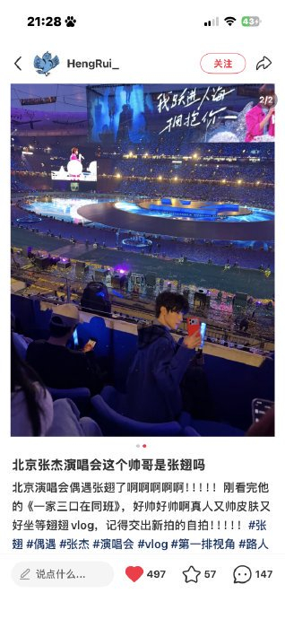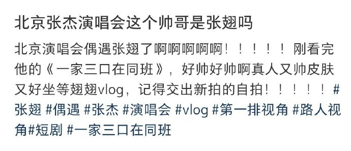 大量粉丝在话题下喊话张翅发布演唱会vlog和自拍,部分账号直接@其微博账号“张张张翅”催促更新。网友评价其气质“安静温柔,比荧光棒更亮眼”,并关联其主演短剧《一家三口在同班》的热播。