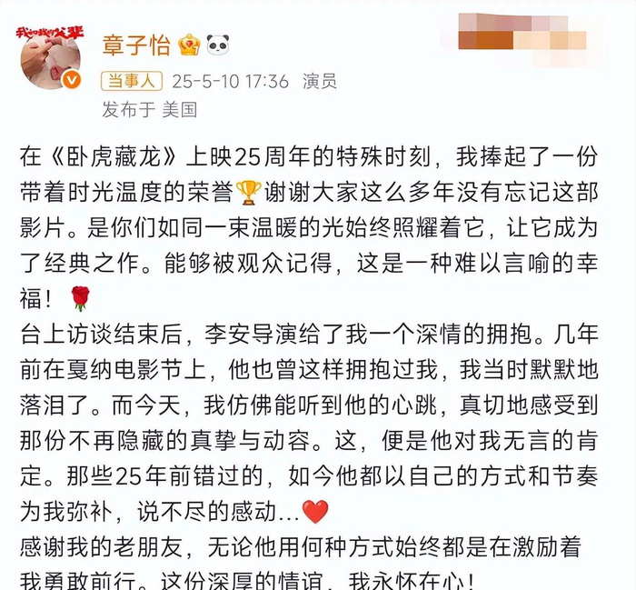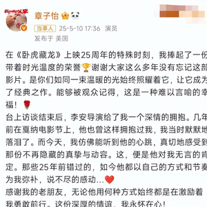 最近,章子怡与李安一同出席了《卧虎藏龙》的重映活动,两人不仅拍了一堆合照,还温馨地拥抱在一起。章子怡在微博上坦言,这次活动弥补了她心中的遗憾,因为当年拍完电影后,导演对她的表现并没有给予特别的肯定。这件事情让人们瞬间回忆起她在出道二十多年来的种种经历。