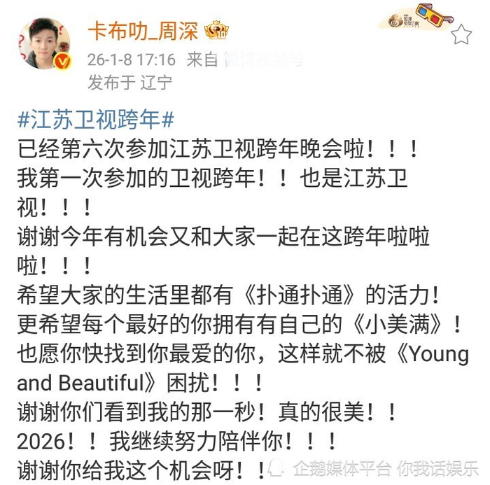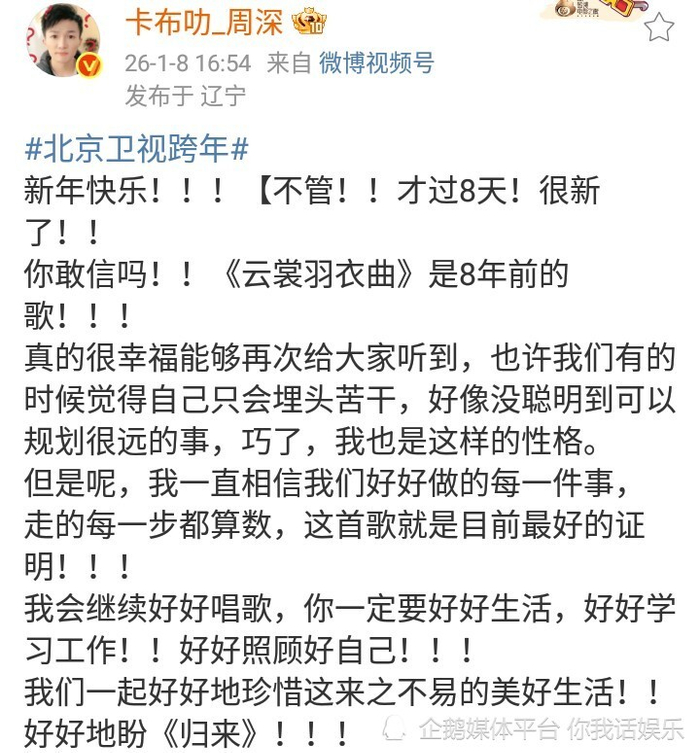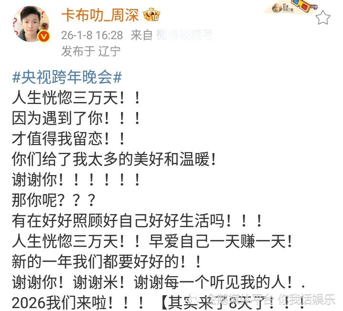 这是歌手周深参加4场跨年晚会的正向反馈!2026年第8天,周深发文