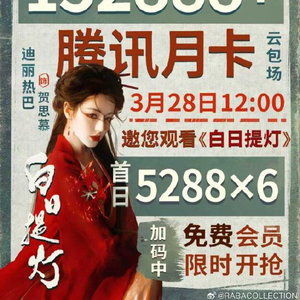 粉丝群体“爱丽丝”为《白日提灯》筹备的首批云包场数量达到152,888份,创下内娱女星单剧应援规模新高。这一数据远超此前女明星粉丝云包场记录(如网传的7万份),被多家媒体称为“女顶流排面”的里程碑式突破。活动中每份包场均附带腾讯视频VIP月卡,通过绑定“观看≥30分钟”的规则,直接计入剧集有效播放量,精准助推热度。