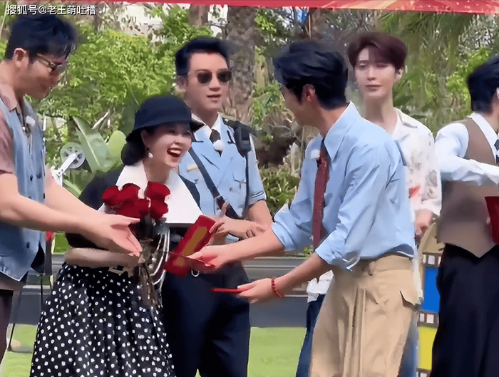 陈哲远一出场就扮成财神爷,一人一个红包发过去,人人都接得挺客气,双手捧着不太好意思拆。