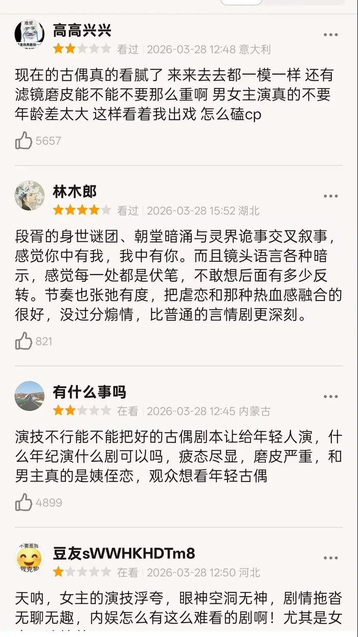 当然差评的观众也是很一致,一方面说男女主年纪大了,尤其是女主。说女主眼里只有疲惫,状态不如以前。