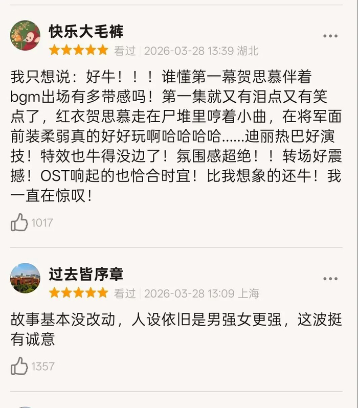 好评的观众觉得特效很牛,氛围感绝,转场震撼。故事基本上没改动,人设依旧是男强女更强。