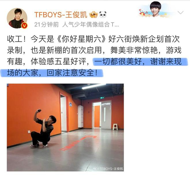王俊凯《你好星期六》下班,晒蹲地自拍营业,感谢粉丝到场支持