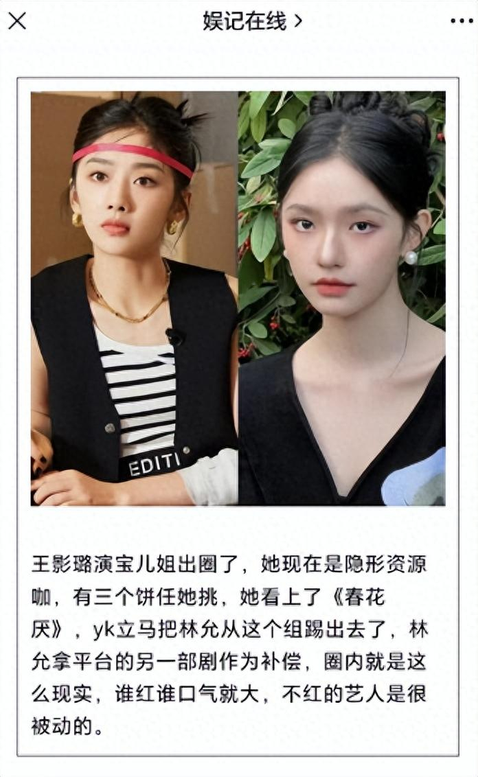 顶替林允的是女演员王影璐,为了弥补林允的损失,制片人用另一部电视剧作为给林允的补偿,显然另一部电视剧不如《春花厌》更有魅力,只是制片人做出这样的决定,应该也是经过多方考量后做出的决定。