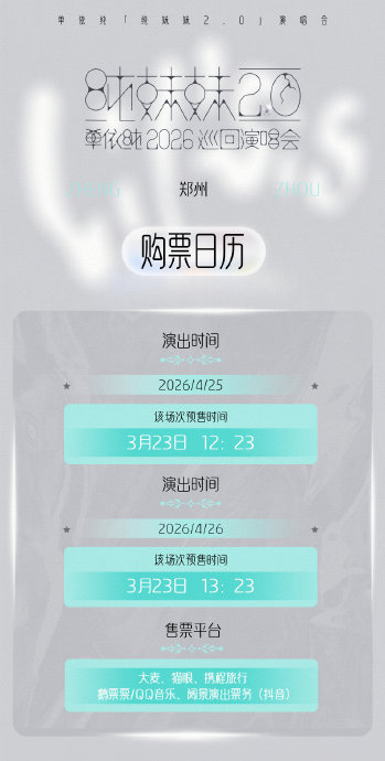 - 郑州站:4月25日场次预售为3月23日12:23,26日场次为13:23。