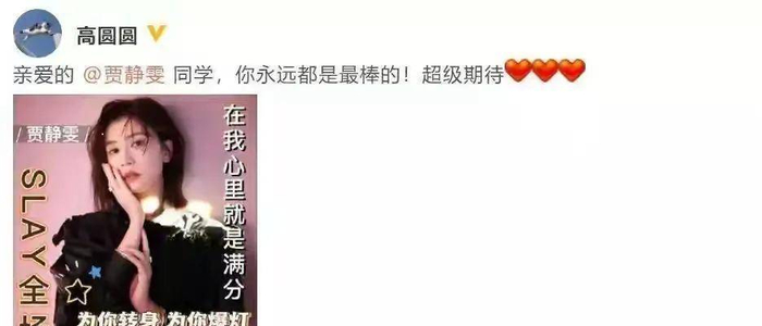 贾静雯也不甘落后,曾经一起主演《倚天屠龙记》的好友苏有朋,高圆圆也站出来为其打Call,友情深厚。