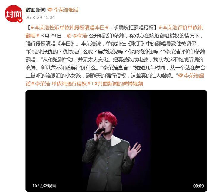 更绝的是,李荣浩提前预判了可能的回应套路,喊话单依纯“希望你不要说你不知道,都是公司干的”,并建议她“不要在今晚的演出中黯然落泪,博取同情”,因为“你想清楚自己可以侵权的那一刻的你是自信的”。这番犀利言辞,直接将事件推向“个人意志”与“团队行为”的讨论深水区。