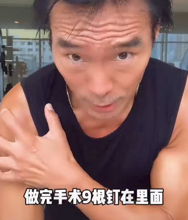 57岁郑浩南晒胸肌,坚持健身40年,手臂里还有9根钢钉