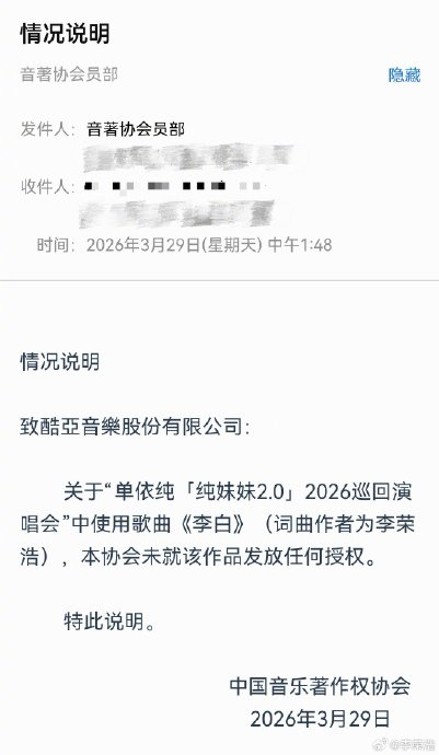 单依纯团队为3月28日至29日的深圳演唱会,曾通过中国著作权协会及李荣浩版权公司申请《李白》翻唱授权,但李荣浩方以邮件形式明确婉拒。
