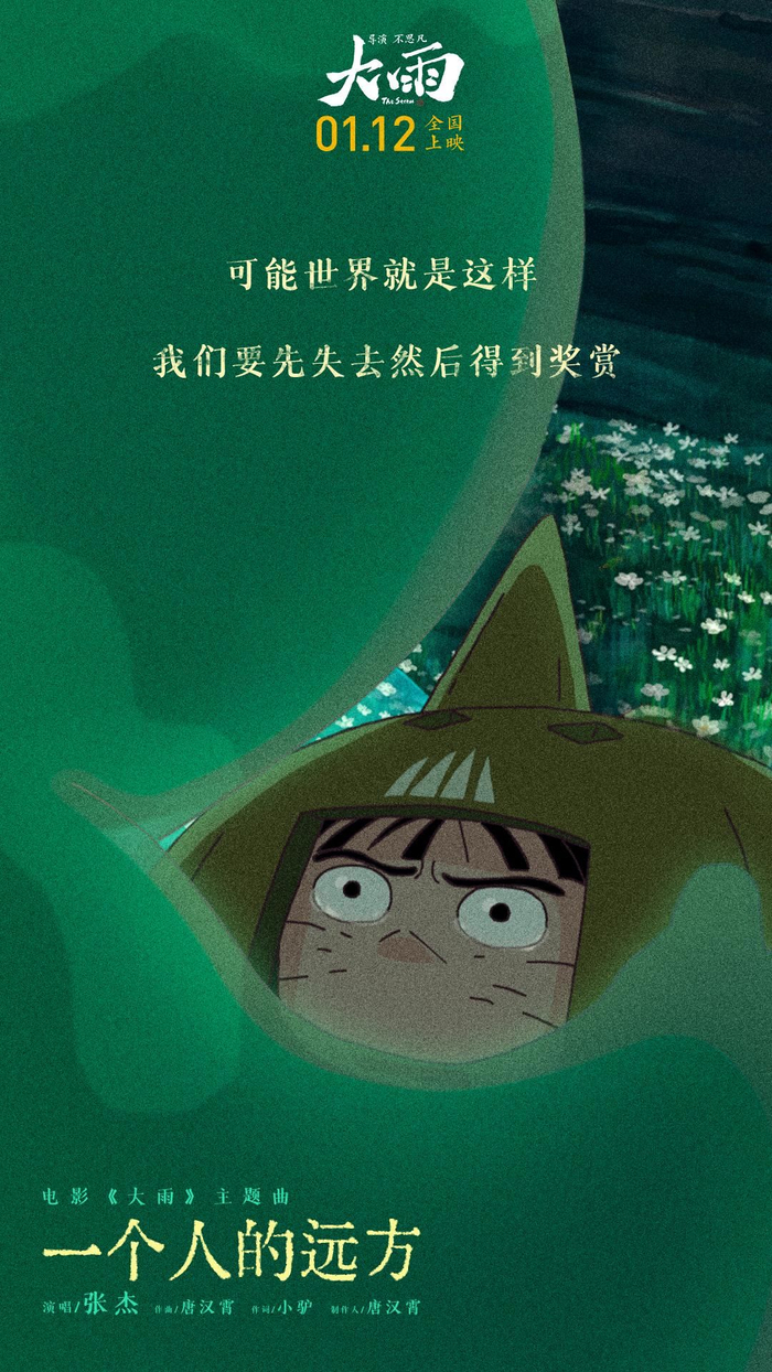 近日,国风奇幻动画电影《大雨》发布主题曲《一个人的远方》。歌曲由歌手张杰演唱,用充满力量的深情嗓音,献给每个“流浪”在人世间的孩子。MV首次曝光男孩馒头和养父大谷子第一次相遇的情景:装有弃婴的木桶飘过村庄,却无一人伸出援手,直到遇到大谷子。《大雨》中的父子情催人泪下:大谷子隐忍无声的“如山父爱”与馒头执着勇敢的“爱的回应”,感动万千网友。电影《大雨》是导演不思凡继《大护法》后,筹制六年的诚意之作;影片讲述一段相互救赎的父子情、一段绝不认输的生死之战。影片将于1月12日全国影院上映,现预售已全面开启。
