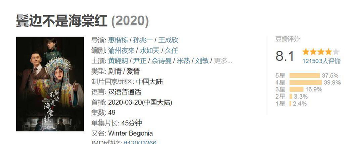 今年口碑、收视都不错的《鬓边不是海棠红》是一部有着神奇色彩的剧。首先这是讲述两个男人故事的剧,且这两个男人还不是小鲜肉,但收视却很不错,尤其是口碑异常地好。不管是服化道,还是演技都颇得观众认可,于是才有了豆瓣8.1分的高分,这些年豆瓣评分上8的剧真的不多。